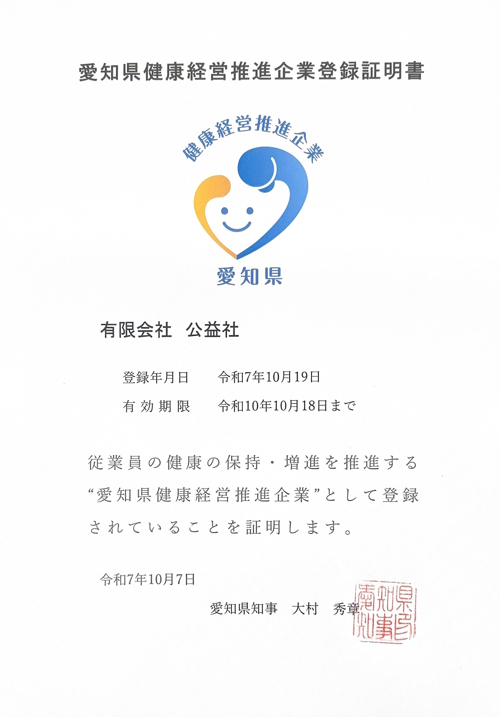 弊社は、愛知県の登録制度における「愛知県健康経営推進企業」に令和4年度に続き認定されました。